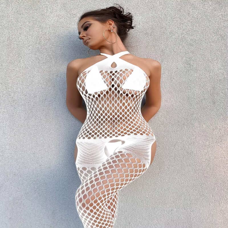 Оригінальний крій з перехресними бретелями на шиї додає образу елегантності, а відкрита структура сітки створює відвертий, але стильний вигляд. Еластичний матеріал м’яко облягає фігуру, не сковує рухів і підходить для різних типів статури.
